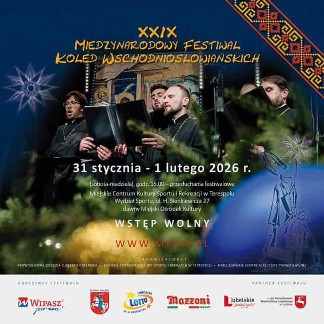 Już 31 stycznia i 1 lutego 2026r. zapraszamy wszystkich miłośników kolęd do Terespola na XXIX Międzynarodowy Festiwal Kolęd Wschodniosłowiańskich. Tegoroczny festiwal odbędzie w Sali widowiskowo-sportowej Miejskiego Centrum Kultury, Sportu i Rekreacji w Terespolu przy ul. Sienkiewicza 27 (dawny Miejski Ośrodek Kultury w Terespolu). Zarówno w sobotę i w niedzielę koncerty rozpoczną się o godz. 15.00.